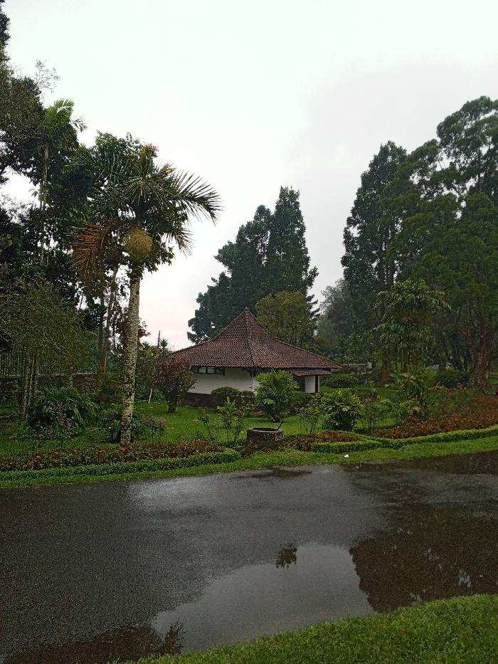 A rainy day scene features a wet, dark asphalt road reflecting the overcast sky. Beyond the road, lush green grass and diverse foliage frame a small, traditional white building with a steeply pitched, dark tile roof. Tall trees surround the structure, adding to the dense, green landscape. The overall atmosphere is damp and serene, showcasing a tranquil natural setting.