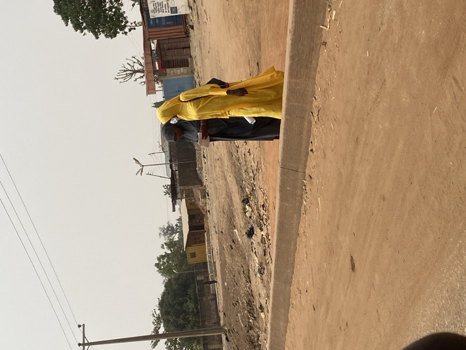 The image captures an outdoor scene in Lapai, Nigeria, under a hazy sky, featuring a reddish-brown dirt road in the foreground