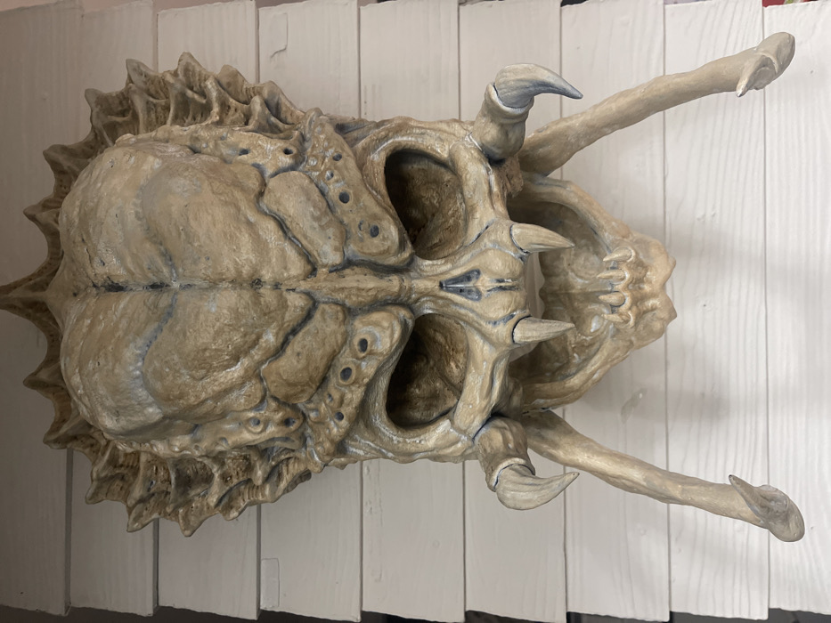 A detailed close-up depicts a creature skull, possibly sculpted or modeled, resting on a white, paneled surface. The skull features a segmented cranium, prominent eye sockets, sharp protuberances near the mouth, and elongated appendages tipped with small claws extending outwards. The coloration is primarily a muted beige with subtle blue-grey accents highlighting contours and details. The overall impression is alien or monstrous, with a textured, organic appearance.