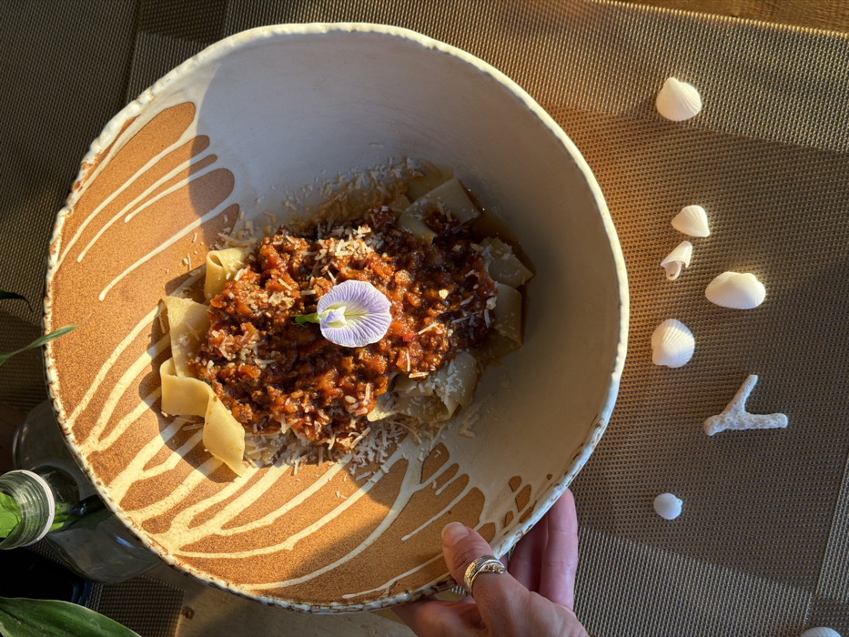 A light-skinned hand, adorned with rings on the index and ring fingers, holds a large, handcrafted ceramic bowl from its left side. The bowl features a sandy-brown exterior with white, abstract wavy patterns and an off-white interior. Inside the bowl, a serving of wide pappardelle pasta is topped with a generous portion of reddish-brown Bolognese sauce, finely grated white cheese, and garnished centrally with a single purple butterfly pea flower. The bowl rests on a woven tan-colored mat, which is also scattered with several small white seashells and a piece of white branching coral. Strong, directional sunlight illuminates the scene from the left, casting distinct shadows. A blurred green plant in a clear glass bottle is visible in the upper left background. The scene is located in the city of Choeng Thale, Thailand.