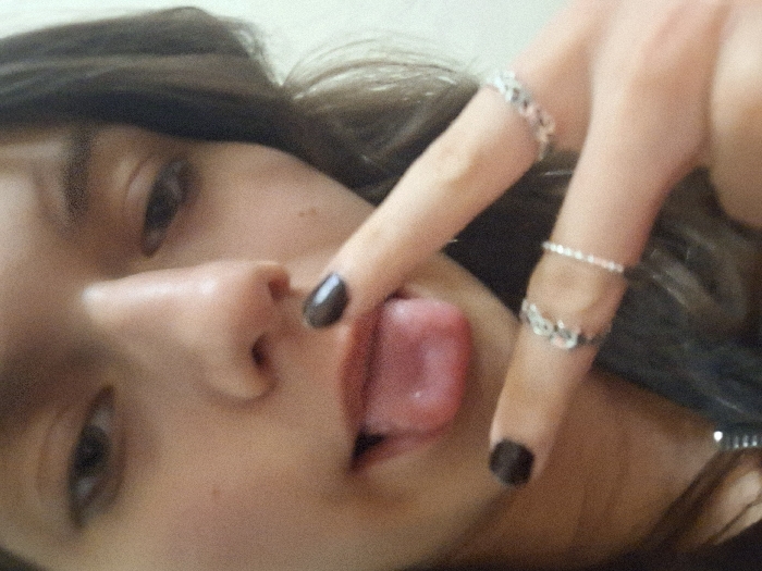A close-up, vertical-format photograph depicts one individual, appearing to be a young female, in what is identifiable as an indoor setting. The individual's face occupies the majority of the frame, angled slightly downwards towards the camera. The subject's dark brown hair frames the face. The individual's mouth is open, with the tongue protruded. The right hand is partially visible, with the index and middle fingers extended in a "V" gesture. The fingernails on these fingers are painted a dark, solid color. The index finger wears a silver-toned ring with a patterned design. The middle finger is adorned with two silver-toned rings: a thin, beaded band and another patterned ring. A silver-toned necklace pendant is visible on the subject's upper chest. The background is uniformly light-colored and out of focus, providing no specific environmental details or landmarks to determine a precise location within the city of Panagyurishte, Bulgaria, beyond indicating an interior space.