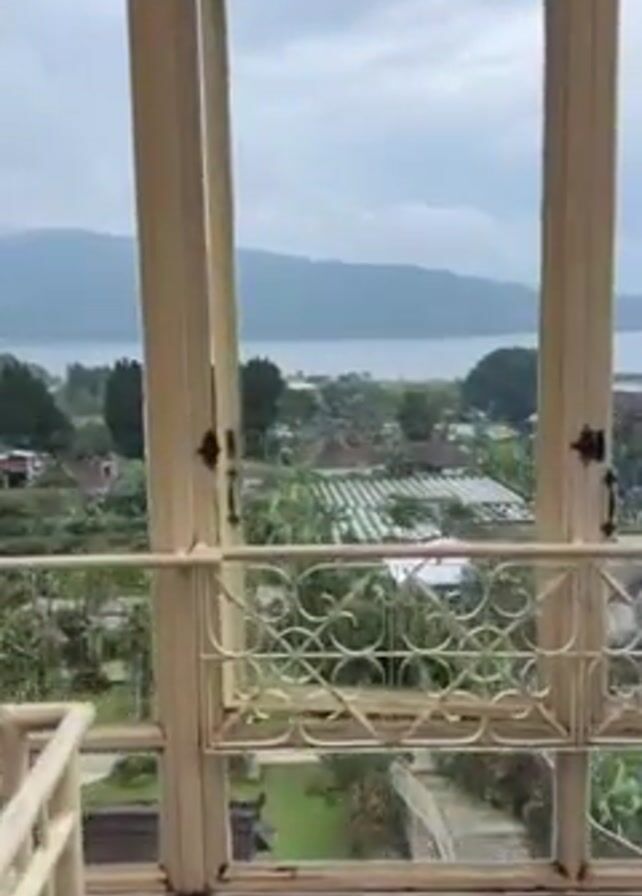 A person closes a white framed window with elaborate metalwork. The window looks out over a green landscape featuring trees, cultivated fields, and rooftops. In the distance, a body of water is visible against a backdrop of mountains under a cloudy sky. The view is from a wooden deck with white railings.