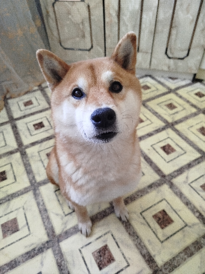 - "A Shiba Inu sits centered on a yellow and brown patterned floor" by FM-WOkM12, licensed under CC BY 4.0