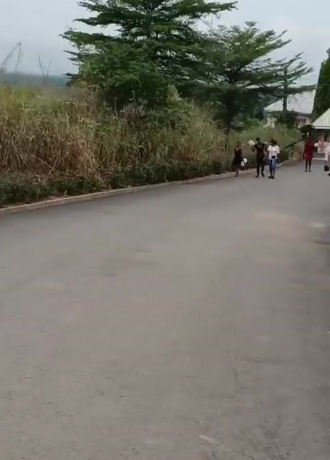 paved road leading towards a building on a slightly overcast day. People are walking in small groups along the road towards the building. There's a car parked near the building. Tall grass and a few trees line the left side of the road. There is a narrow concrete gutter on the right side. A small rock is visible on the road near the camera at the beginning of the video.