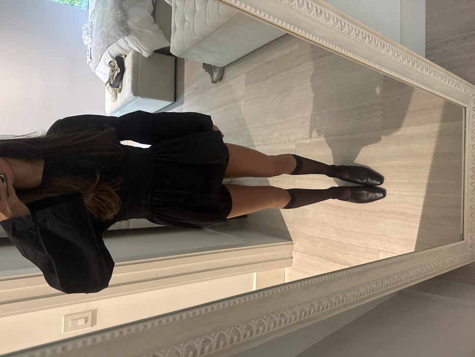 A person is depicted taking a full-body mirror selfie in what appears to be a residence in Palmetto Bay, United States. The individual, whose face is largely obscured by a smartphone held up for the photograph, has long, dark brown hair and is dressed in a black ensemble consisting of a long-sleeved top with voluminous sleeves and a peplum waist, black shorts or bloomers, sheer black knee-high socks, and black square-toed flat shoes. The reflection is captured in a large, rectangular mirror with an ornate, off-white frame. The flooring is a light-toned, possibly marble-effect, tile or laminate. In the background, a brightly lit room is visible, featuring a white upholstered bench or ottoman with a light-colored blanket and bag, a bed with white and gray bedding, a visible window allowing natural light and showing green foliage outside, and a pair of light-colored athletic shoes on the floor. An electrical outlet is present on the wall to the left.