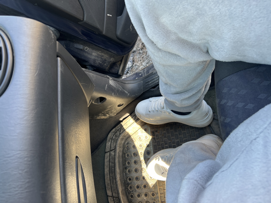 The image presents a ground-level view from within a vehicle, specifically from the passenger side, looking down towards the floor and out an open door