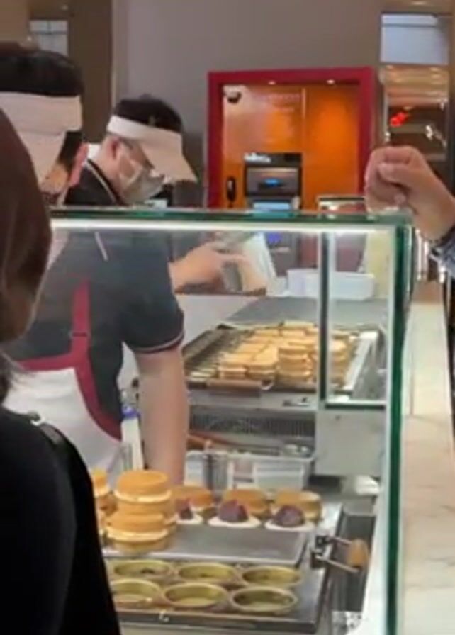 A man in a black shirt, red suspenders, a white apron, and a white visor, is behind a glass counter preparing food. He wears a mask. He takes items from a hot plate with rounded compartments and places them on a cooling rack. There are stacks of filled, round cakes on the cooling rack. Other items are on the hot plate, ready to be closed. People are on either side of the counter observing the man at work. The area is bright and appears to be inside a shopping mall. A sign is visible with the word “Tawanpai”.
