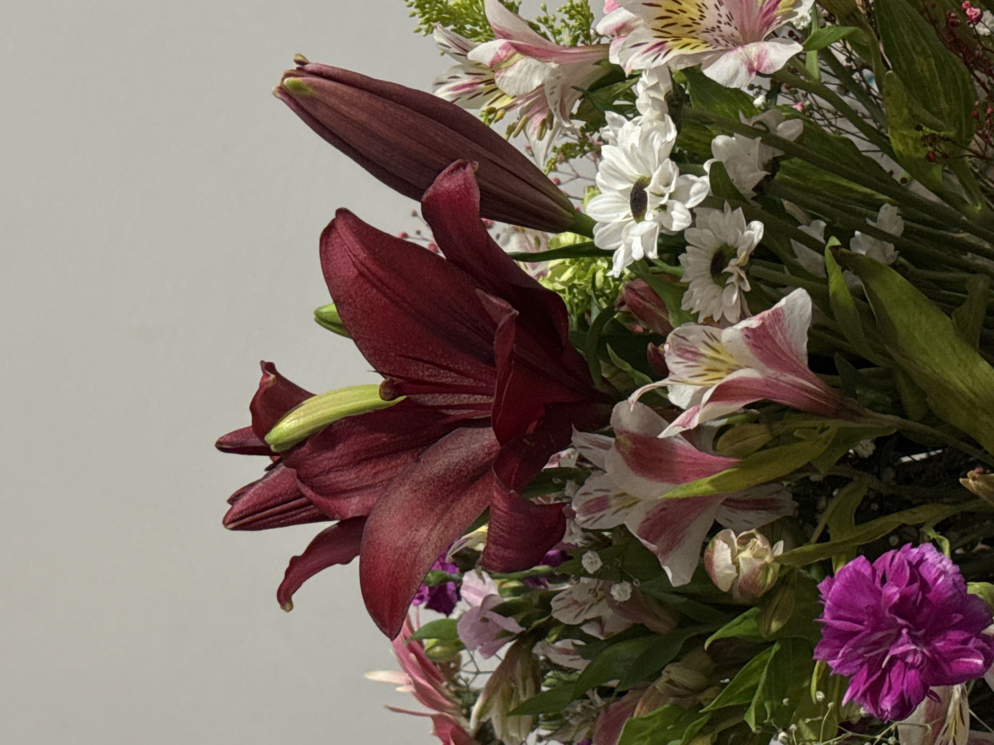 A close-up shot of a bouquet of various flowers. Prominently featured are dark red lilies in full bloom and bud. Other flowers include white daisies, pink and white Alstroemeria, and a purple carnation. Green foliage is interspersed among the flowers. The background is a plain, light grey. The location is not identifiable from this image.