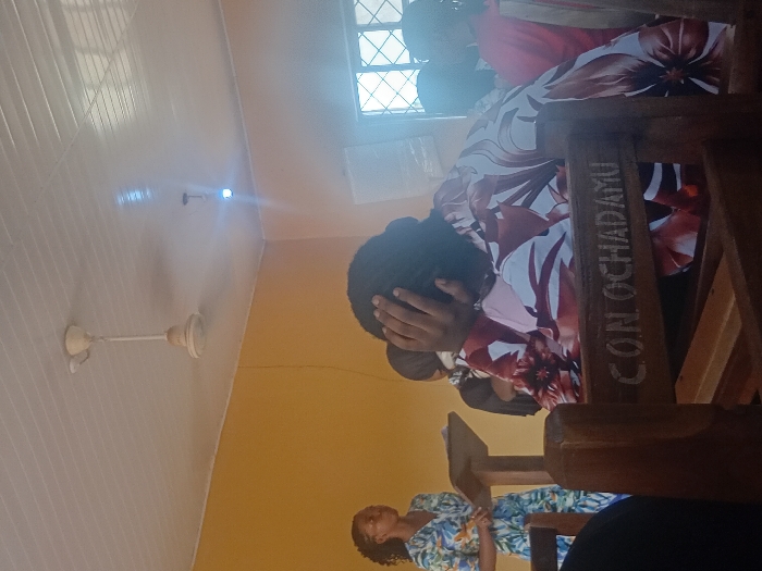 This image captures an indoor scene in Ayangba, Nigeria. The room features yellow-orange walls and a white paneled ceiling with a centrally mounted white ceiling fan and a distant blue light fixture. A window with dark security grilles is visible on the right, admitting ambient light. In the foreground-midground, a person with dark, curly hair is seated, facing away from the camera, wearing a white, red, and brown floral patterned garment. Their head rests on hands clasped over the back of their head. They are seated behind a wooden chair with "C.O.N. OCHADAMU" inscribed on its backrest. To the left, a woman with dark, curly hair stands at a wooden lectern, wearing a blue, green, and white patterned dress, appearing to address the seated group. Additional individuals are partially visible in the background, mostly seated, with one person in a red shirt discernible on the far right.