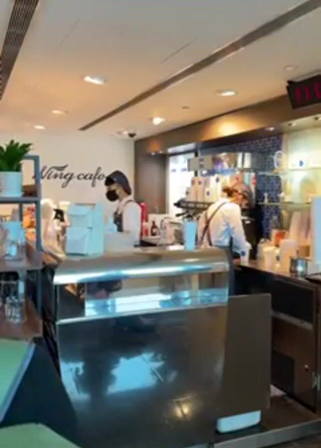 two individuals working behind the counter of a cafe. They are both wearing aprons and face masks. One of the individuals is preparing drinks, and the other appears to be taking orders. The cafe has the name "Living cafe" on the wall, and there are various coffee-making tools and supplies on the counter. The camera is positioned from the customer's perspective.
