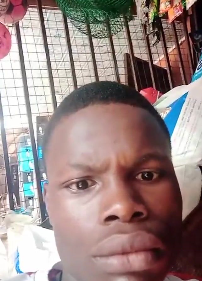 A close-up selfie video features a dark-skinned young man with short, dark hair and a serious expression. His eyes dart from side to side. He is wearing a white shirt with hints of red or maroon at the collar. The background shows a wire mesh cage and various items hanging from the top, including green netting, pink and red balls, and packages of snacks or small products. A large white bag is also visible behind him. The setting appears to be a small store or market stall.