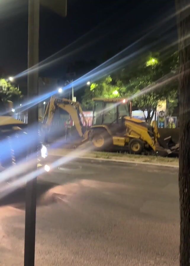 nighttime scene of what appears to be road construction work in an urban setting. A yellow backhoe is parked on the side of the road with a person in a safety vest standing nearby. A large semi-truck with a white trailer drives past the camera, creating streaks of light from its headlights. Streetlights illuminate the scene, and trees are visible in the background. The camera is positioned on the sidewalk, partially obstructed by a pole.