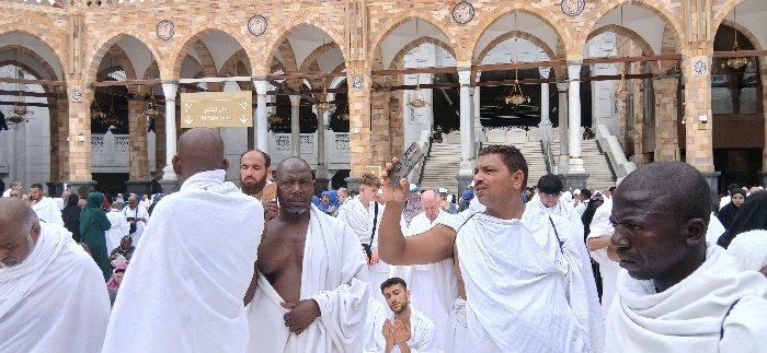 This image captures a bustling outdoor scene within the Grand Mosque (Masjid al-Haram) complex in Makkah Al Mukarramah, Saudi Arabia. The background consists of light brown stone architecture featuring multiple large arched porticoes supported by columns, with decorative elements and chandeliers visible. A beige rectangular sign displaying "Al Fateh Gate" in Arabic and English, accompanied by downward arrows, is visible on the upper left. Through an archway on the right, a set of wide stairs with railings is discernible. The foreground is populated by a diverse group of individuals, predominantly men dressed in white ihram garments, indicative of pilgrims performing Hajj or Umrah. A few women are present, attired in dark abayas and hijabs. Essential subjects include: * On the far left, a man with a bald head, seen from behind, wearing ihram. * Towards the center-left, a man with dark skin, a bald head, and a beard, looking directly forward, wearing ihram. * In the mid-right, a man with medium skin tone and short dark hair, wearing ihram, is captured with his right arm raised, holding a dark rectangular object (possibly a smartphone) upwards. His mouth is open, suggesting speech or chanting. * On the far right, a man with dark skin and short dark hair, wearing ihram, is partially visible, looking downwards and to his left with a strained or concentrated expression. * In the lower-center, a younger man with dark hair and a beard is kneeling or sitting on the ground, facing away, with his hands clasped in front of him, possibly in prayer. The individuals are standing, walking, or engaging in religious observation within a densely crowded environment, underscoring the significant gathering of pilgrims.