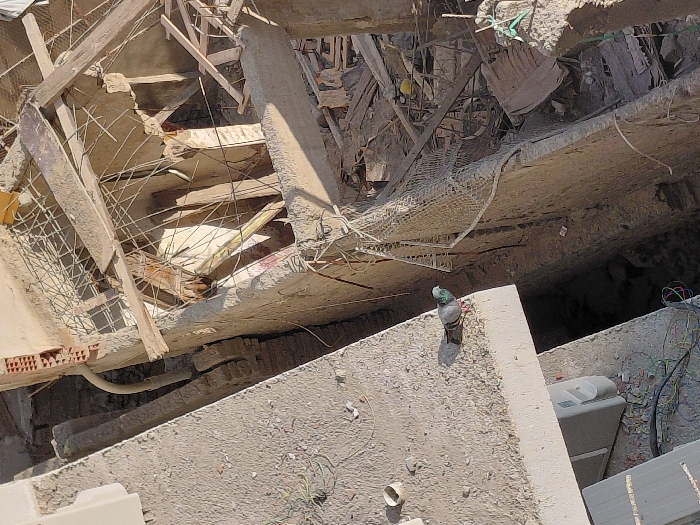 A building's interior is partially collapsed, exposing concrete beams, rebar, and debris. A pigeon stands on a concrete surface in the foreground, seemingly unaffected by the destruction. Electrical wires are visible along the edge of the foreground. The scene suggests damage and the pigeon's presence offers a contrast between nature and destruction.