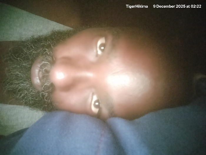 A close-up selfie features a person with dark skin and a salt-and-pepper beard lying down. The camera angle is skewed, presenting a tilted perspective of their face, including their eyes, nose, and mouth. The person appears to be resting on a blue surface, possibly a blanket or piece of clothing. A date and time stamp, "TigerHikima 9 December 2025 at 02:22," is visible in the upper right corner of the image.