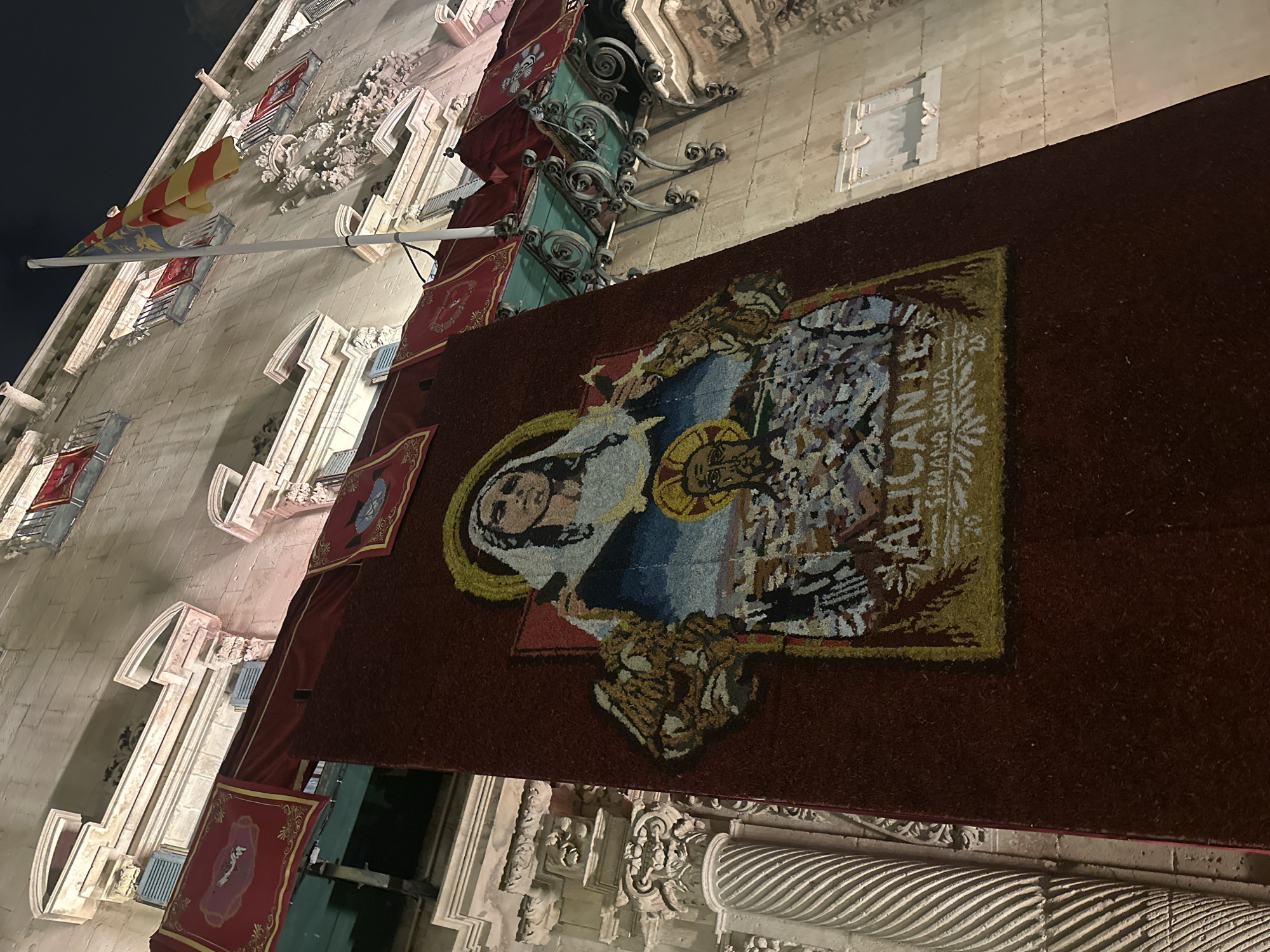 The image depicts a building facade adorned with banners and flags, likely in Alicante, Spain. The architectural style of the building suggests it may be a historical structure, possibly a city hall or government building. A large banner featuring an image of the Virgin Mary and the word "Alicante" is prominently displayed. Smaller banners with heraldic symbols or patterns are also visible, hanging from windows or balconies. The image is taken at night, with the building illuminated by artificial light.