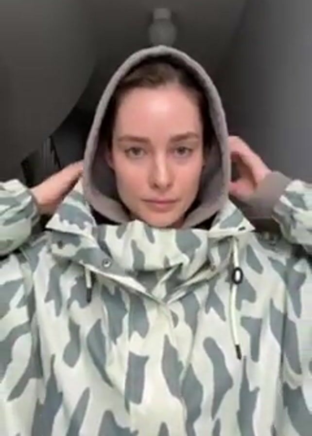 A woman with pale skin, reddish-brown hair in a bun, and light-colored eyes is standing in a hallway and adjusting the hood of a light-colored, zebra-striped poncho
