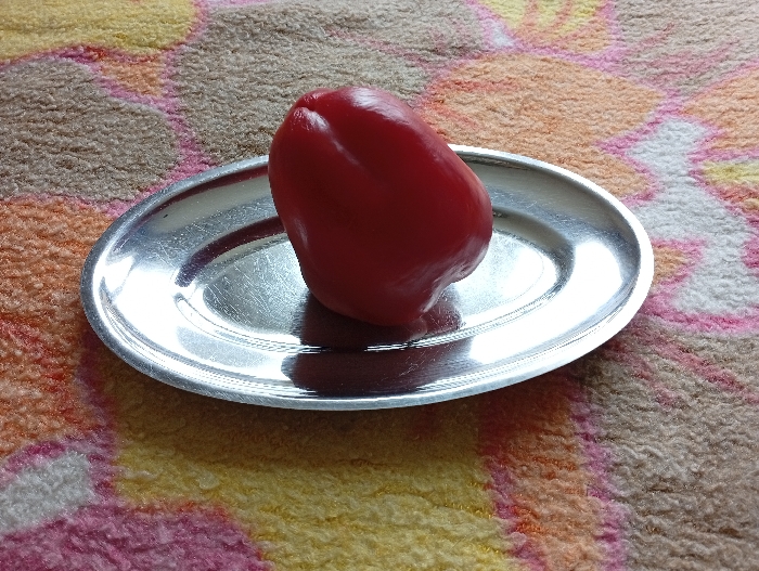 - "A single, whole, red bell pepper stands upright, slightly tilted, on a small, oval-shaped, metallic plate with a raised rim" by FM-tIMEp2, licensed under CC BY 4.0