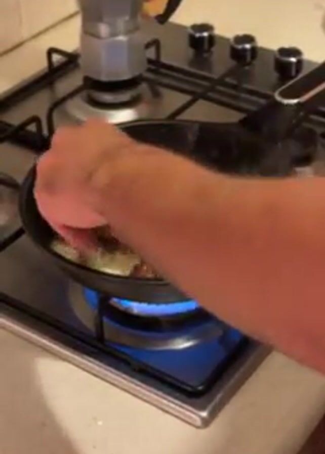 A man is cooking in a kitchen. He's adding sprigs of a leafy green herb, likely thyme or rosemary, to a steak cooking in a frying pan on a gas stovetop. The steak is visibly browning and there is a generous amount of butter or oil in the pan. A Moka pot sits on the stovetop behind the pan. The man's hands are visible, and part of his tattooed arm is also in view. The kitchen appears to be well-lit, clean, and modern.