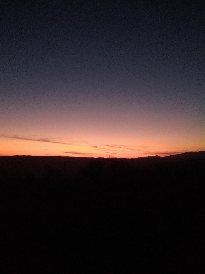 A gradient sky transitions from dark blue at the top to a warm orange horizon. Thin clouds streak the orange band. Below, a dark, silhouetted landmass fills the lower portion of the frame. Slight variations in the horizon suggest the presence of distant hills or mountains, barely discernible against the blackness. The overall impression is of a serene, dusky landscape.