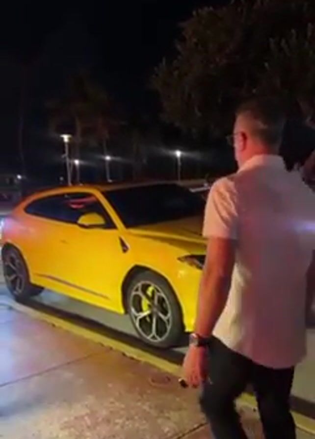 At night, three people walk by a yellow Lamborghini Urus parked along a curb with palm trees behind it. The first person is a light-skinned male wearing a light-colored short-sleeved shirt and dark pants. The second person is also a light-skinned male, wearing a white T-shirt and a cap. The third person is a light-skinned female wearing a long dark-colored robe. The background is dark, with streetlights providing some illumination.
