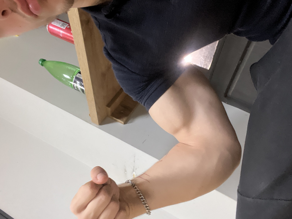 The image depicts an indoor scene located in Sandanski, Bulgaria. A male individual is partially visible, showcasing a flexed right arm with a prominent bicep, the hand clenched into a fist. A silver-colored chain bracelet adorns the individual's right wrist. The person is wearing a dark, short-sleeved polo shirt and dark trousers. The background consists of a plain light-colored wall. Mounted on this wall is a light-toned wooden shelf, holding a green plastic bottle with a green cap and a partially visible label, alongside a red aluminum beverage can. A bright, rectangular light source, consistent with a window, is visible in the lower right portion of the frame.