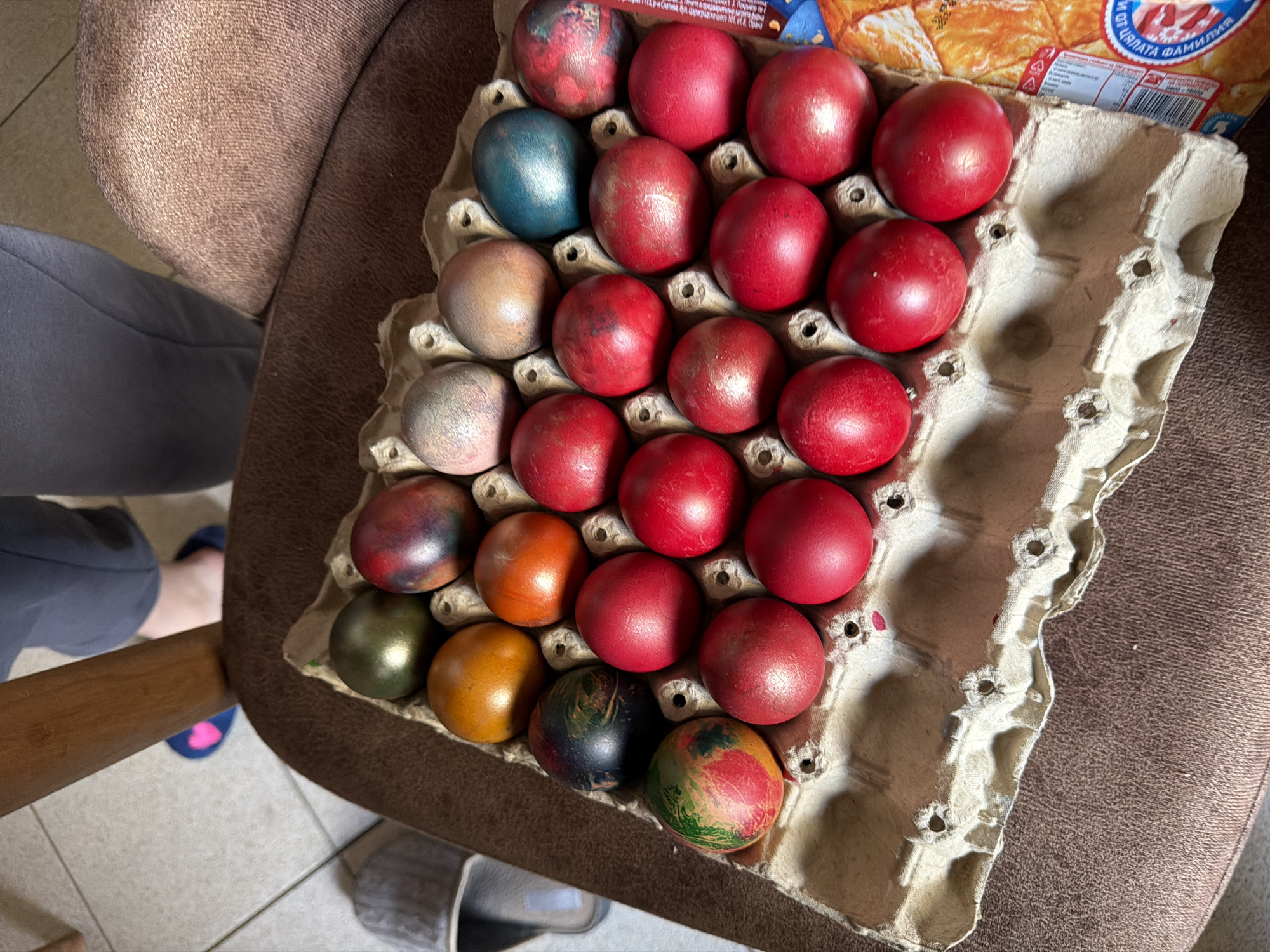 The image depicts an egg carton filled with dyed Easter eggs. The eggs are predominantly red, but also include colors such as blue, brown, gold, orange, and green. The egg carton is resting on a brown upholstered surface, possibly a chair. A package of pastries is visible in the upper right corner of the image, with Cyrillic writing suggesting a connection to Bulgaria. Based on the package, the location can be narrowed to Zlatna Panega, Bulgaria. Part of a person's leg and foot in a slipper are visible in the lower left corner, implying someone is nearby.