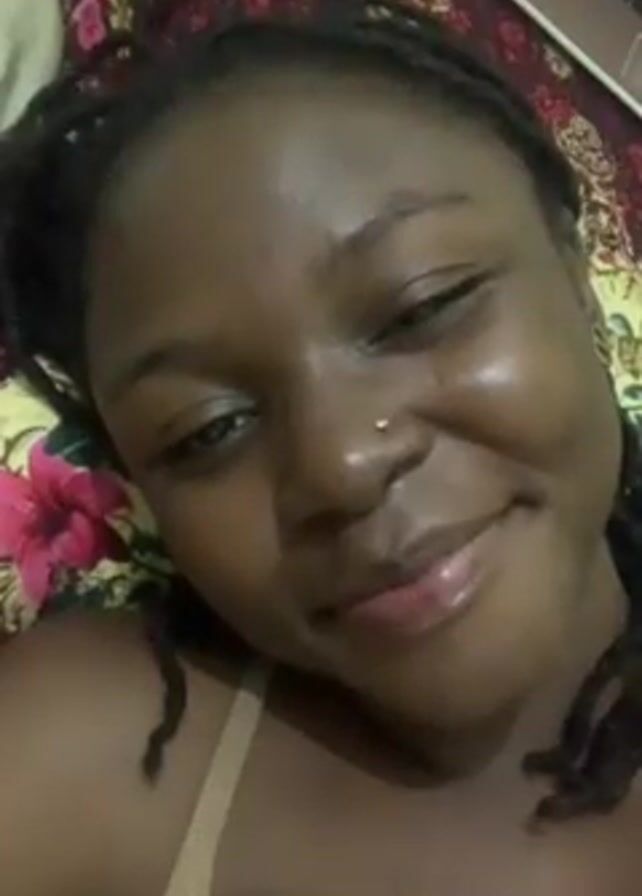 A close-up, low-angle selfie shows a woman with dark brown skin, dark eyes, and dreadlocks, lying on a bed with a floral patterned bedspread