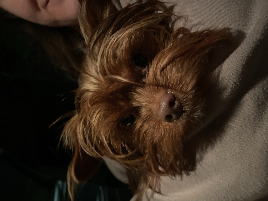 - "The image depicts a close-up of a small domestic canine, possibly a Yorkshire Terrier, with reddish-brown and tan fur, dark eyes, and a pinkish-brown wet nose" by FM-03WT23, licensed under CC BY 4.0