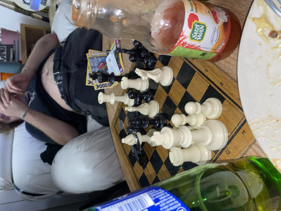 The scene depicts an indoor, casually lit environment, contextually located in Lyon, France. In the background, a person with curly, light-brown hair, wearing a black t-shirt and dark, distressed pants, is seated in a light-colored armchair. Their midsection is exposed, and their hands are raised towards their face. A light blue bracelet is visible on their left wrist. In the mid-ground, a wooden chessboard with dark and light squares is positioned on a table. White and black chess pieces are scattered across the board, not in a formal game setup. Prominent white pieces include a king, two rooks, and three pawns in the foreground. Visible black pieces include a king, a rook, a bishop, and several pawns. A silver-colored ring lies on a dark square of the board. Behind the black king, three lottery scratch tickets are stacked, one displaying "GOAL" and two showing "3 000€." In the foreground, a partially visible green glass bottle with a blue and white label is present on the left. On the right, a clear glass bottle of "Suzi Wan Sauce Aigre Douce" (Sweet and Sour Sauce), with a "330g" label, stands upright. A white ceramic plate with food remnants is partially visible in the immediate foreground, suggesting a recently consumed meal.