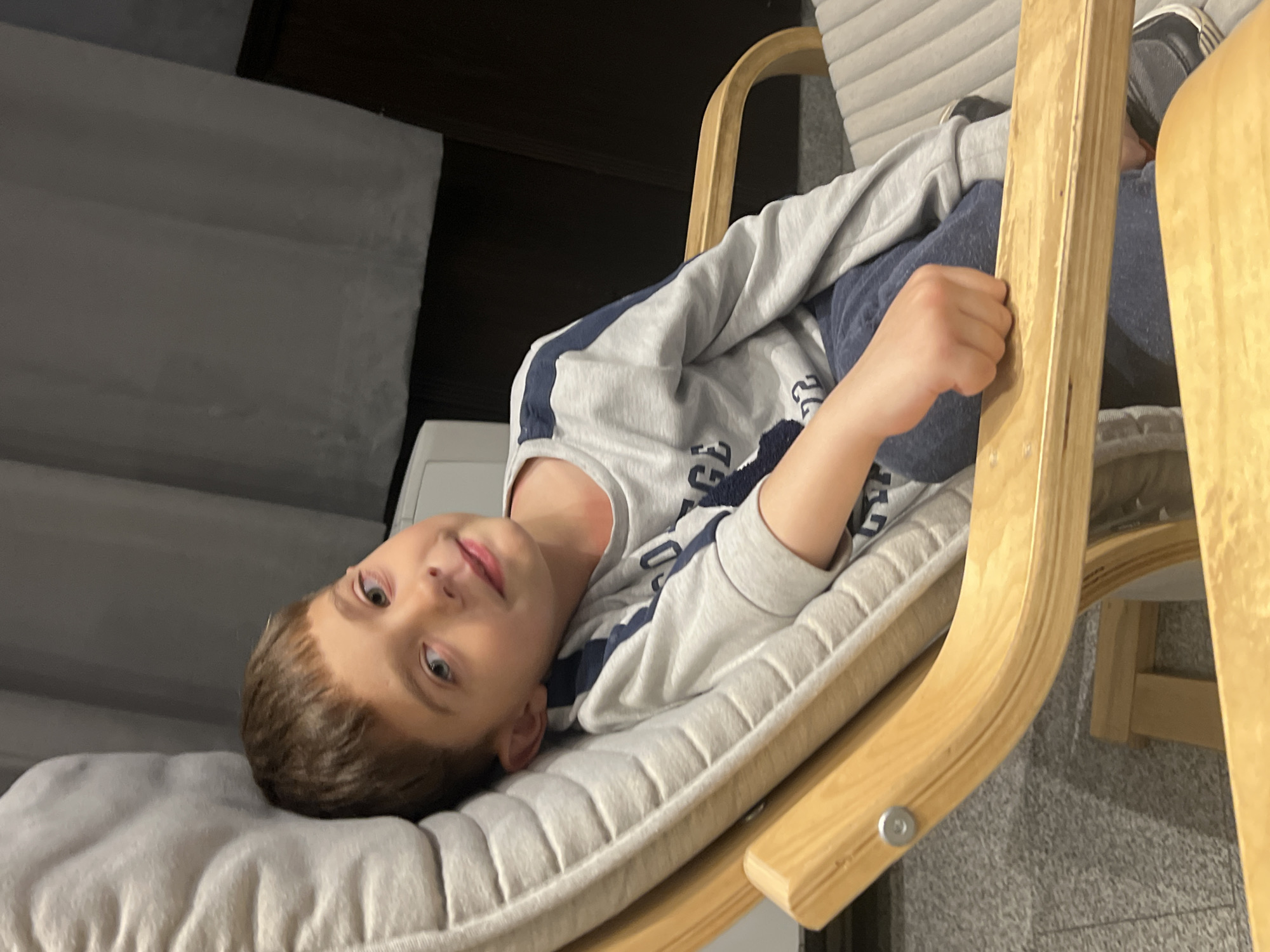 A young boy reclines in a light wood rocking chair with a gray cushioned seat and back