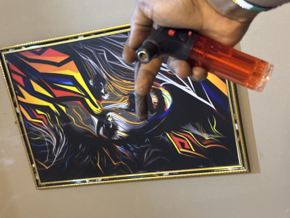 The image displays an indoor scene located in Lokoja, Nigeria. A framed artwork hangs on a light beige wall. The artwork is a stylized portrait of a female face, rendered with flowing lines and geometric shapes in yellow, orange, red, blue, and white against a black background. The artwork is encased in a gold-colored, reflective rectangular frame. In the foreground, a dark-skinned hand holds a dark-colored cigar horizontally. Simultaneously, the hand grasps a red, transparent torch lighter, positioning its nozzle near the cigar's end. A bracelet with white and green beads is visible on the wrist.