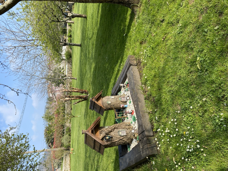 This image captures a vibrant garden scene in Villaviciosa, Spain, under clear blue skies. The foreground features a rectangular raised garden bed, constructed from dark, weathered timber sleepers. Inside this bed, white pebbles form a base for two primary decorative elements: two miniature, rustic "fairy houses" crafted from tree stumps with dark shingled roofs. The left house shows a small gnome figure peering from a window, while the right house displays a tiny door. Between the houses, a miniature swing set holds a small figure, and other diminutive characters, including gnomes and a black cat, are arranged amongst small green and red decorative elements and white stones, creating a whimsical tableau. The raised bed is bordered by well-maintained, bright green grass interspersed with small white daisies. The midground expands into a large, verdant lawn, dotted with various trees; some exhibit sparse, bare branches, indicative of early spring, while others bear fresh green foliage or subtle pink blossoms. Three light brown chickens are visible grazing on the grass towards the left side of the midground. In the background, residential buildings with light-colored walls and terracotta roofs are partially obscured by trees and a low stone wall. Distant hills or mountains rise on the far left horizon. A utility pole with overhead lines is present on the left side of the frame. Sunlight, casting soft shadows, illuminates the entire scene from the right.