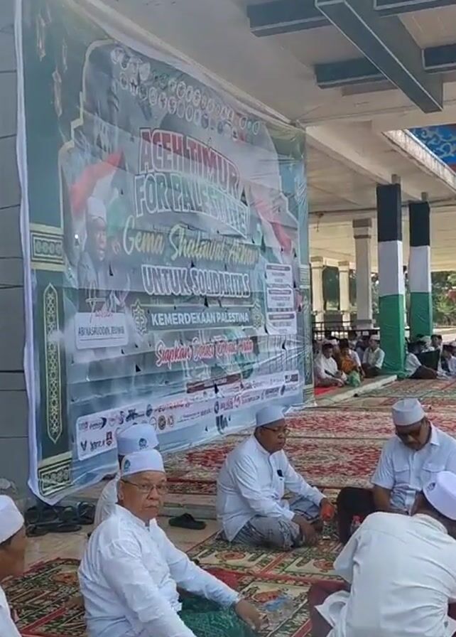 gathering of Muslim men sitting on rugs under a covered area with a banner that says "Aceh Timur For Palestine" and "Gema Shalawat Akhir Untuk Solidaritas"