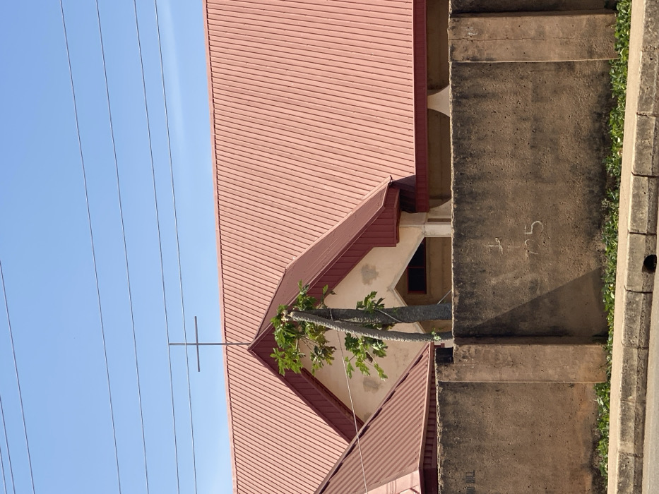 The image captures a building, likely a church, in Bukuru, Nigeria, under a clear blue sky