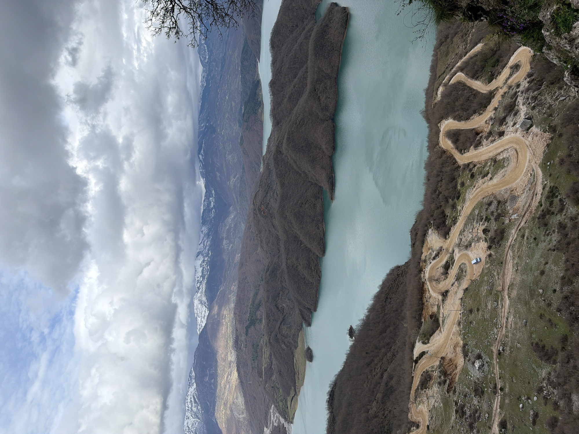 This image depicts a landscape in Kruja, Albania. The scene includes mountains, a body of water, a winding dirt road, vegetation, and cloudy skies. In the background, snow-capped mountains can be seen under a cloudy sky. The water body appears turquoise and is surrounded by mountains covered in trees. On the right side of the image, a steep hillside is visible, with a series of switchbacks forming a dirt road. A single car is parked on one of the switchbacks. The vegetation on the hillside is sparse, with a mix of grass and small trees.