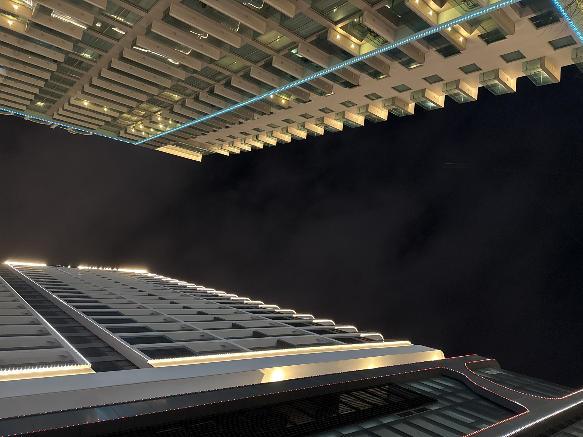- "The image displays a nighttime, upward-angled view between two illuminated high-rise buildings in Đà Nẵng, Vietnam, creating a narrow vertical expanse of dark sky" by FM-VtZBW2, licensed under CC BY 4.0