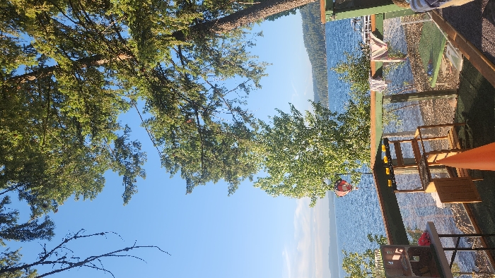 An elevated outdoor deck, covered with a green surface, overlooks a large body of water and distant forested hills under a clear blue sky. The location is a waterfront property in Harrison, United States. In the foreground, an orange conical object stands centrally. To the left, a multi-level wooden structure, resembling a dollhouse or shelving unit, rests on a dark rectangular table. A red object lies beside it. To the right of the orange cone, a multi-tiered wooden stand holds several yellow objects on its upper surface. A wooden railing system, featuring dark green posts and a lighter top rail with transparent or mesh panels, separates the deck from the water. Clothing items, including a tan garment and a white garment, are draped over the railing on the right side. Below the railing, on a narrow, light-colored pebbly shoreline, a green rectangular mat is visible near the water's edge. The midground features a wide expanse of blue water, consistent with a lake, showing surface ripples. A red and white hot air balloon-shaped decoration or lantern is suspended over the water near the immediate shoreline. The background consists of distant land, densely covered with green trees and appearing hilly or mountainous, bordering the far side of the water. The upper portion of the image is dominated by a clear, bright blue sky with sparse white clouds. Tall, dark green coniferous trees frame the scene from the top and right, their branches and foliage well-lit by sunlight. No individuals are clearly visible, and no active interactions are depicted.