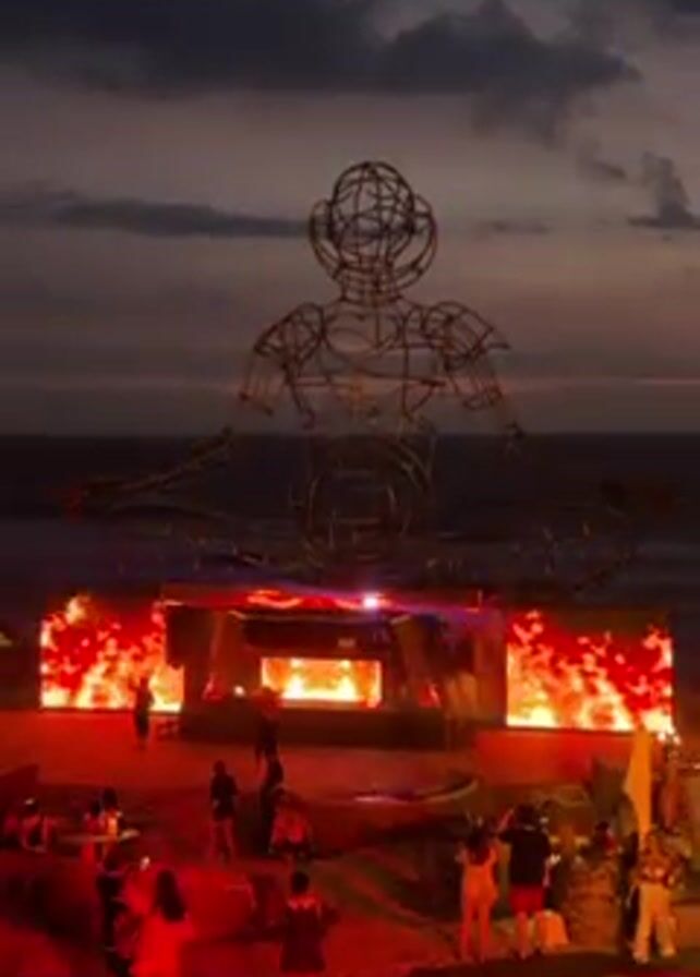n outdoor music stage on a beach at dusk. A large wire sculpture of a person in a meditative pose stands prominently above the stage. The stage has two large screens displaying fiery images, and there are people standing and walking around the stage area. The sky is dark with clouds, and the ocean is visible in the background.