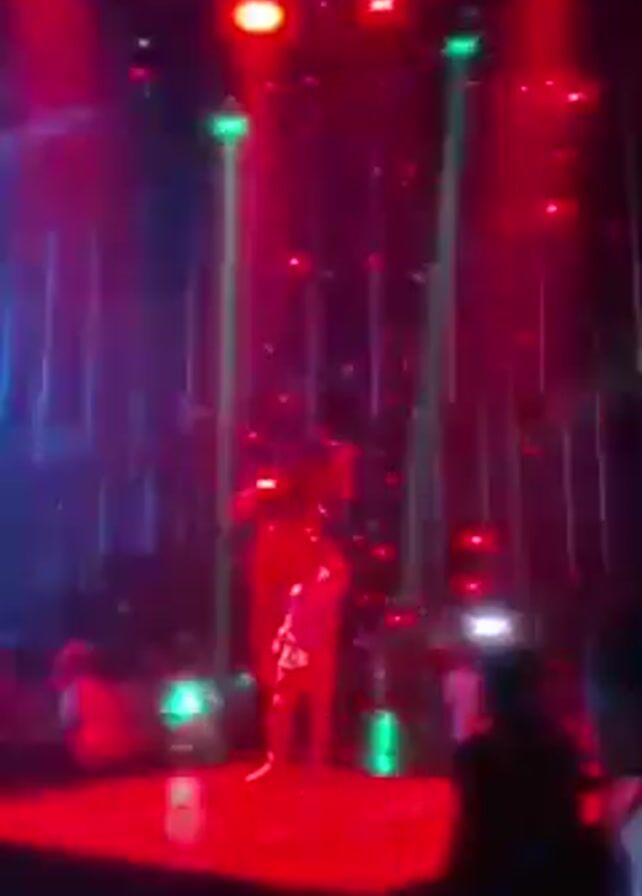 A person stands on a brightly lit red stage with green and red spotlights. The person is wearing a sparkly outfit and appears to be performing. There is a crowd of people in the background, and someone is recording the performance with their phone.