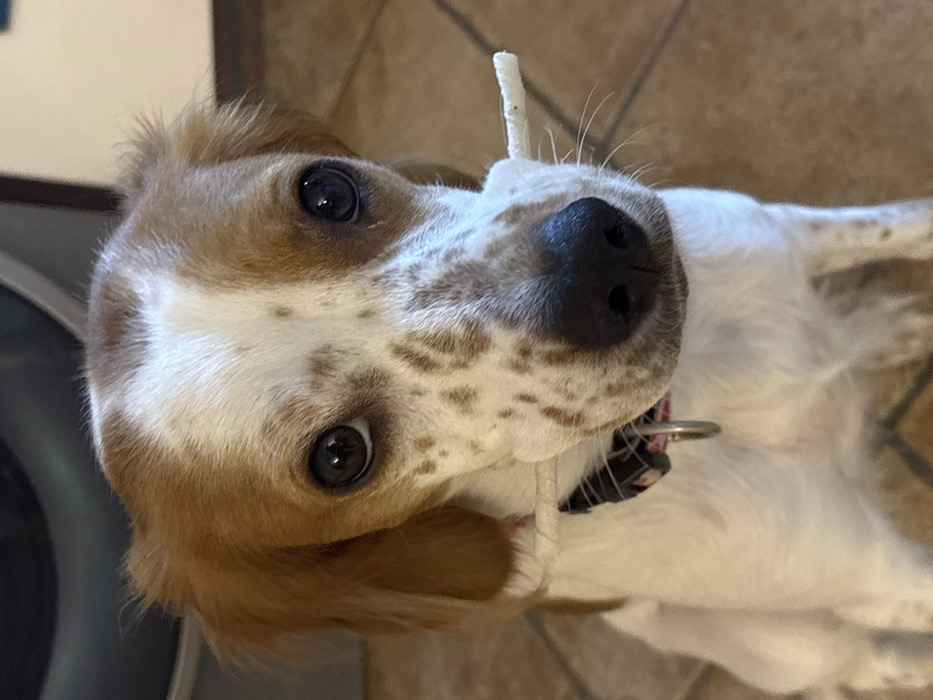 - "A medium-sized dog with white and reddish-brown fur, consistent with a Brittany Spaniel, is centrally positioned in an indoor, eye-level photograph" by FM-XwPUS2, licensed under CC BY 4.0