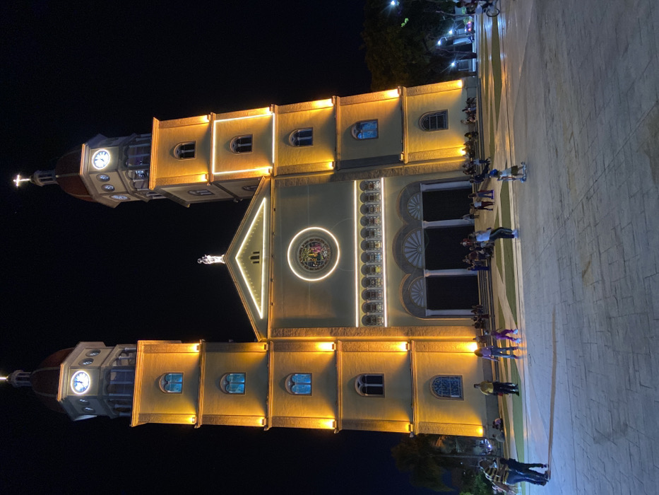 A church stands illuminated at night, its architecture adorned with lights highlighting the facade. Two towers with clocks flank the main structure, topped with domes and crosses. Below, a paved area hosts groups of people, their silhouettes visible in the artificial glow. The scene is dominated by the church's symmetrical design and the festive ambiance created by the lighting.