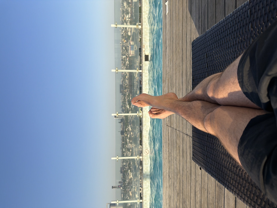 - "An elevated, first-person perspective photograph captures a person's lower torso, legs, and bare feet, crossed at the ankles, resting on a dark, woven lounge chair" by FM-jbClG3, licensed under CC BY 4.0