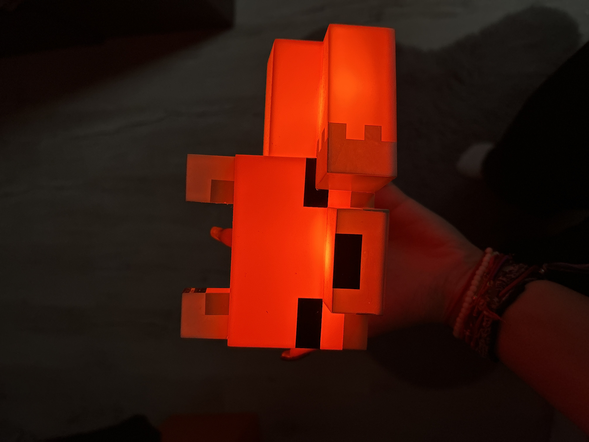 A brightly lit, orange, blocky Minecraft fox lamp is being held in someone's hand. The lamp has black squares representing the eyes and nose. The arm and hand of the person holding it are visible, adorned with several bracelets. The background is dark, suggesting a dimly lit room, with parts of a floor and furniture visible in the shadows. The location is not discernible from the provided image. Therefore, it's impossible to ascertain whether it's in Sofia, Bulgaria, or anywhere else.