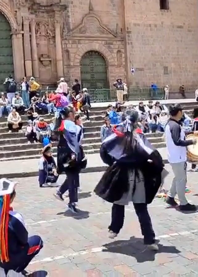 group of young people performing a dance in a public square. They are dressed in school uniforms and colorful traditional hats. Some of them are kneeling on the ground while others are dancing and moving around them. One person is playing a drum. A crowd of people is sitting on the steps of a large stone building in the background, watching the performance. The square is paved with cobblestones, and there are colorful ropes and other props scattered on the ground. The weather appears to be sunny and cloudy.