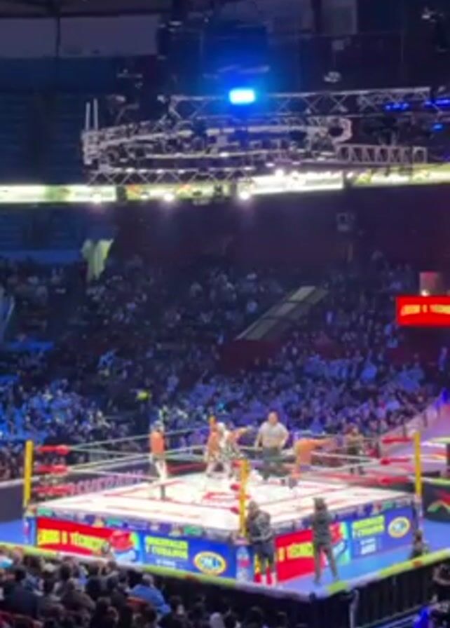 wrestling match in a crowded arena. Four wrestlers are in the ring, one of whom is wearing a white mask. A referee is also in the ring. The crowd is cheering. A large display screen hangs above the ring. A banner on the ring says "Lucha a Tecnica y Cuales."