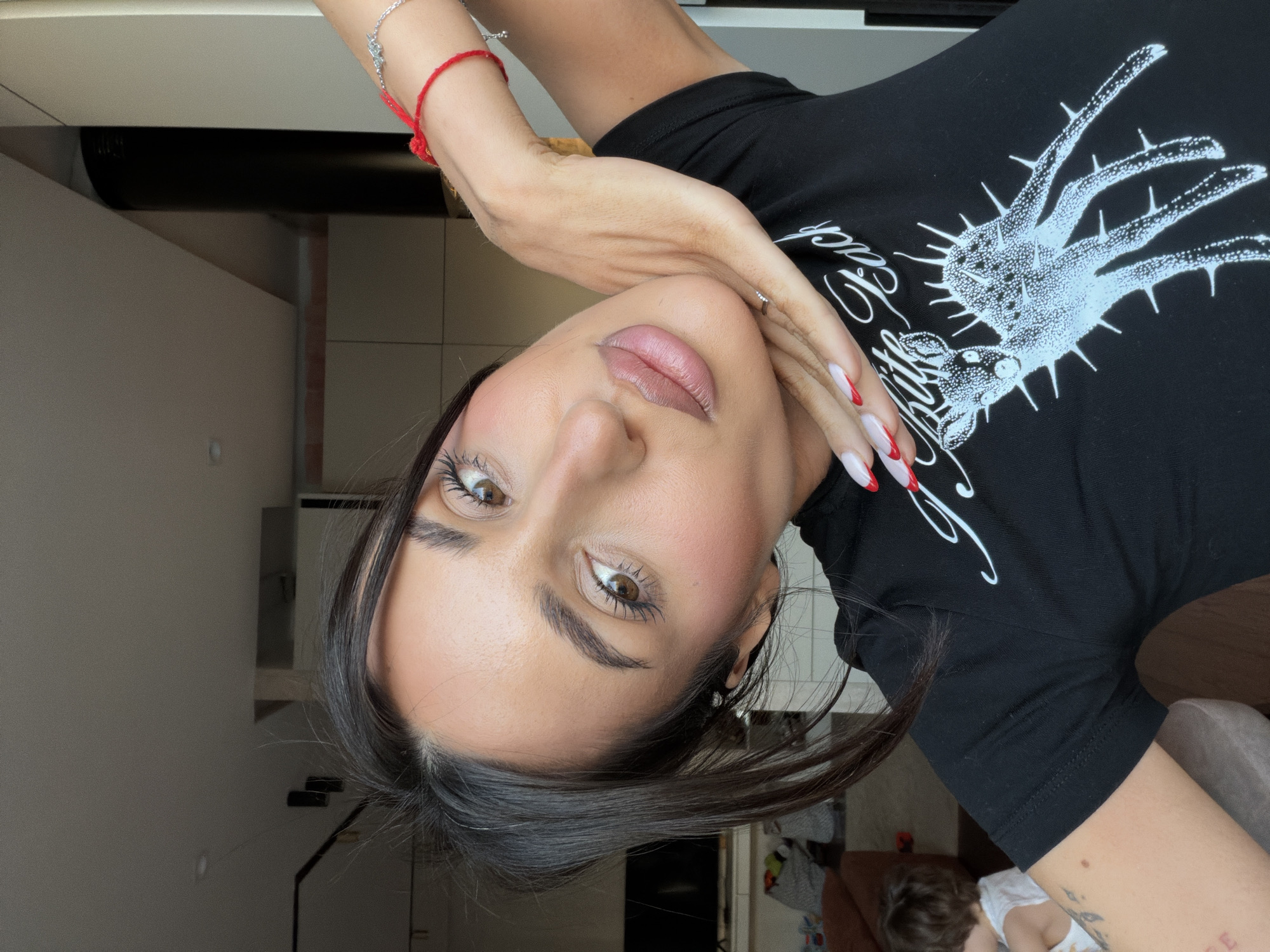 A close-up selfie-style portrait depicts a woman in an indoor residential setting. The woman, with dark brown hair and light brown eyes, has her head slightly tilted to the right and gazes directly at the camera. Her left hand is positioned with splayed fingers against the right side of her jawline and neck. She wears a black short-sleeved t-shirt featuring a white graphic of a spiked deer and the partially visible text "White F_ _k". Her left wrist bears a red string bracelet and a silver chain bracelet with a butterfly charm. Her fingernails are manicured in a French tip style with white tips and a thin red line. In the blurred lower-left background, a young child with light brown curly hair, wearing a white sleeveless top, is partially visible. The background environment includes light-colored walls, a ceiling, modern light-toned cabinetry, a dark vertical support or fixture, and a wall-mounted television screen. Location: City of Unknown, Unknown.