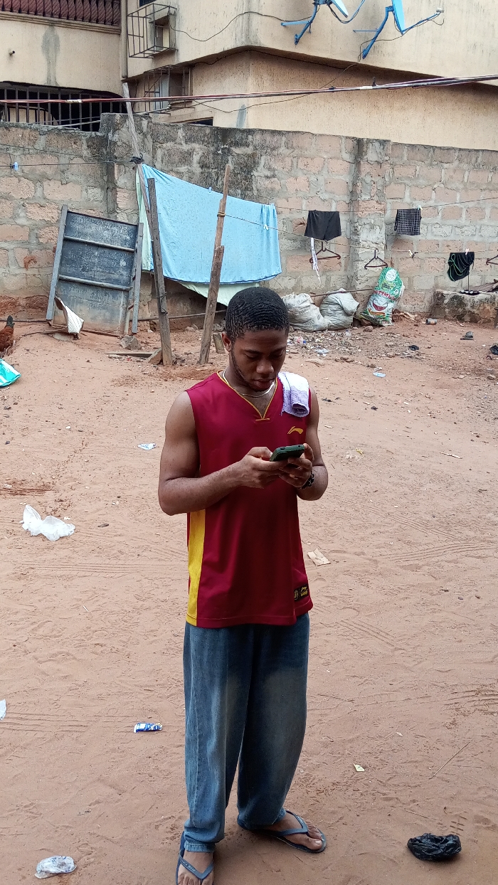 A young man stands outside, engrossed in his phone. He's wearing a maroon and yellow sleeveless shirt, baggy blue jeans, and flip-flops. A white towel is draped over his shoulder. The ground is dirt with scattered trash. Behind him is a block wall with clothes hanging on a line. There's also a leaning board and some bags. The setting appears to be a courtyard or backyard area. Buildings with satellite dishes are visible in the background.