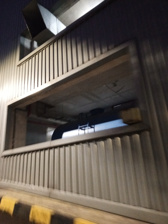 A building's exterior wall is composed of vertically ridged gray panels with a large, rectangular opening. Inside the opening, there's a gray ceiling with various pipes and a small ladder. The opening is framed by the same vertically ridged panels, creating a balcony-like appearance. At the bottom, a row of yellow and black blocks provides a safety barrier. Overhead, air ducts extend above the building's edge.