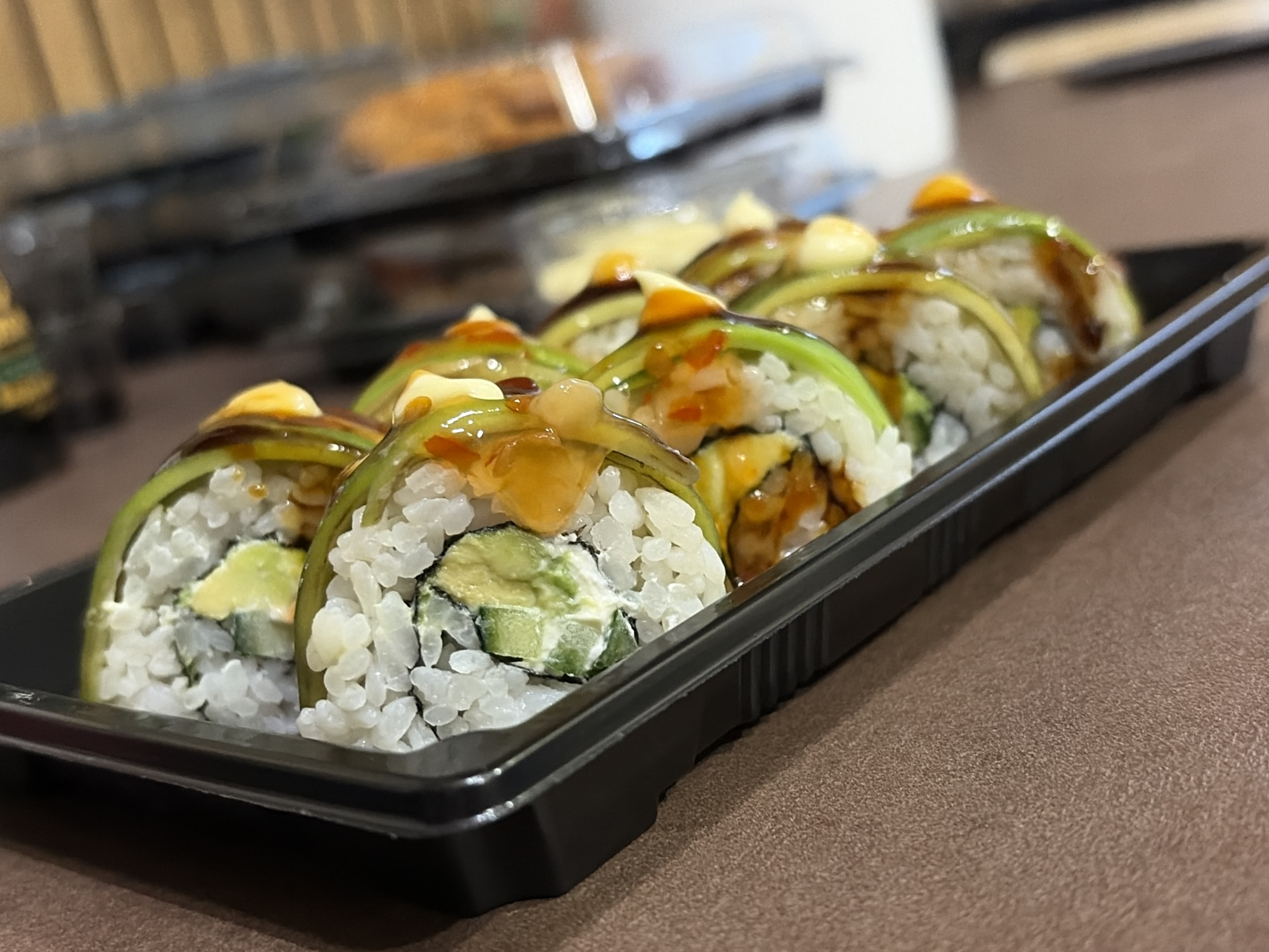 A close-up shot depicts a row of sushi rolls arranged in a black plastic container. The sushi rolls are made with white rice, filled with avocado and cucumber, and topped with a sauce of some kind. The rolls are positioned in a row inside the container, angled to the side. The background shows additional containers and a surface with a brown table. It is daytime. The location in the city of Pleven, Bulgaria cannot be determined from the picture.